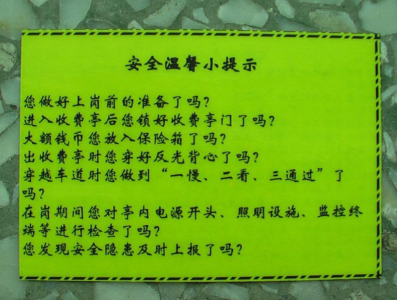 該站首先召開了專題會,精心組織,周密安排,營造濃厚的“安全生產(chǎn)月”活動氛圍;其次是形式多樣,務(wù)求實(shí)效。利用安全知識、安全提示卡、安全知識小測試等形式,普及安全生產(chǎn)常識。三是做好安全生產(chǎn)隱患自查自改工作。站安全領(lǐng)導(dǎo)小組集中對站內(nèi)的收費(fèi)、監(jiān)控、機(jī)電設(shè)施等重點(diǎn)區(qū)域進(jìn)行了安全排查,針對發(fā)現(xiàn)的問題進(jìn)行了整改。四是深化班組長在崗期間安全生產(chǎn)負(fù)責(zé)制。實(shí)施班組安全檢查制,每天由班組負(fù)責(zé)上崗期間收費(fèi)亭、收費(fèi)廣場的安全檢查,填寫《班組安全檢查記錄表》,做到了安全工作與業(yè)務(wù)工作的有效結(jié)合。( 110國道沙城收費(fèi)站 王輝)