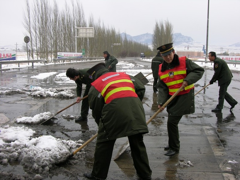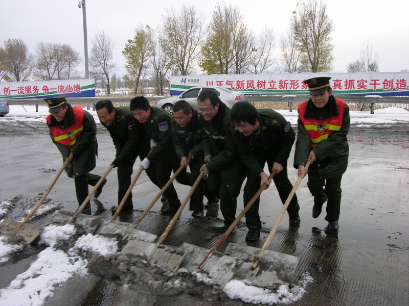 一是根據(jù)下雪時間調(diào)整除雪方案。1日上午一直在下雪,考慮到此時人工除雪效果不大,站領導決定采取灑布融雪劑的方法進行除雪,對收費車道、收費廣場、院內(nèi)重點場所揮灑融雪劑,杜絕了積雪增多、結冰的現(xiàn)象。下午雪停后,則采取了人工除雪的方案。
