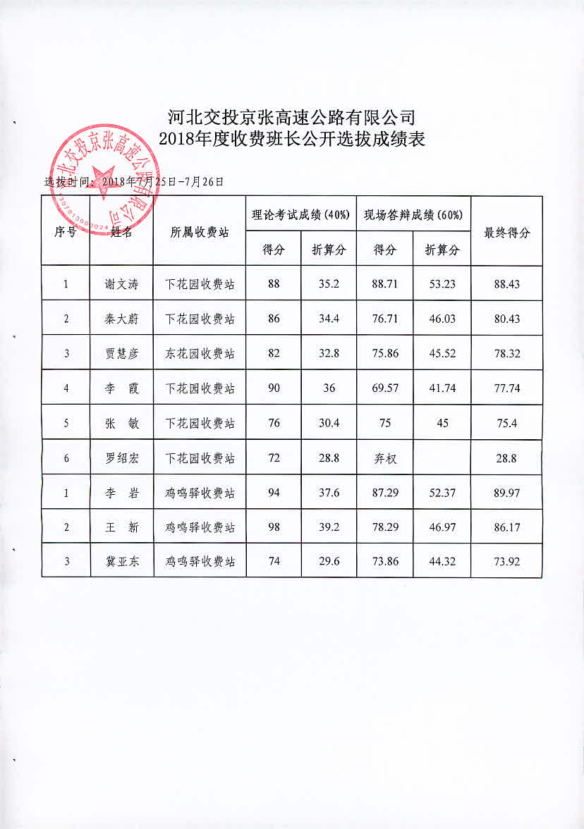 公司2018年收費(fèi)班長(zhǎng)公開(kāi)選拔成績(jī)公示