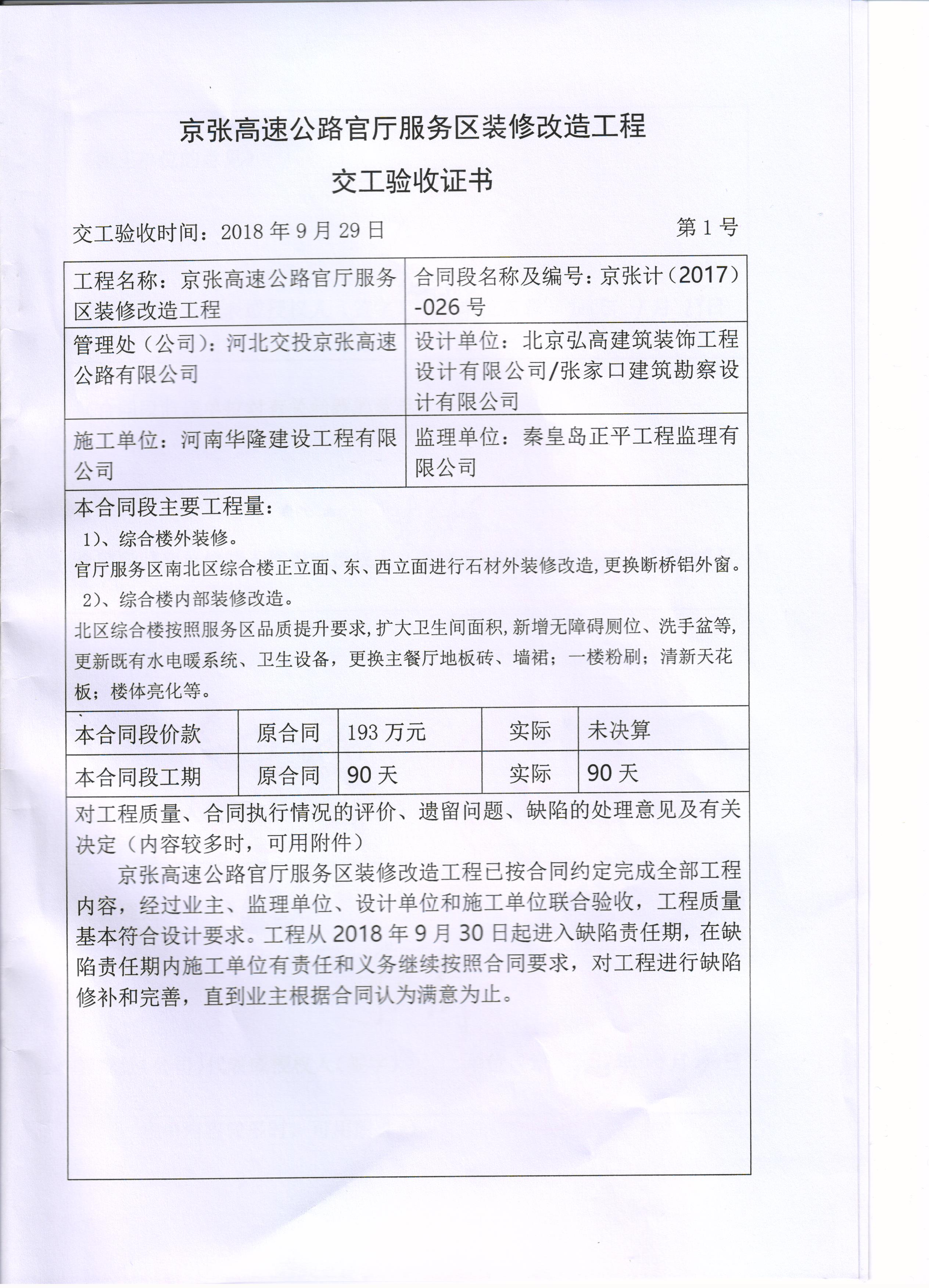 京張高速公路官廳服務(wù)區(qū)裝修改造工程交工驗(yàn)收?qǐng)?bào)告