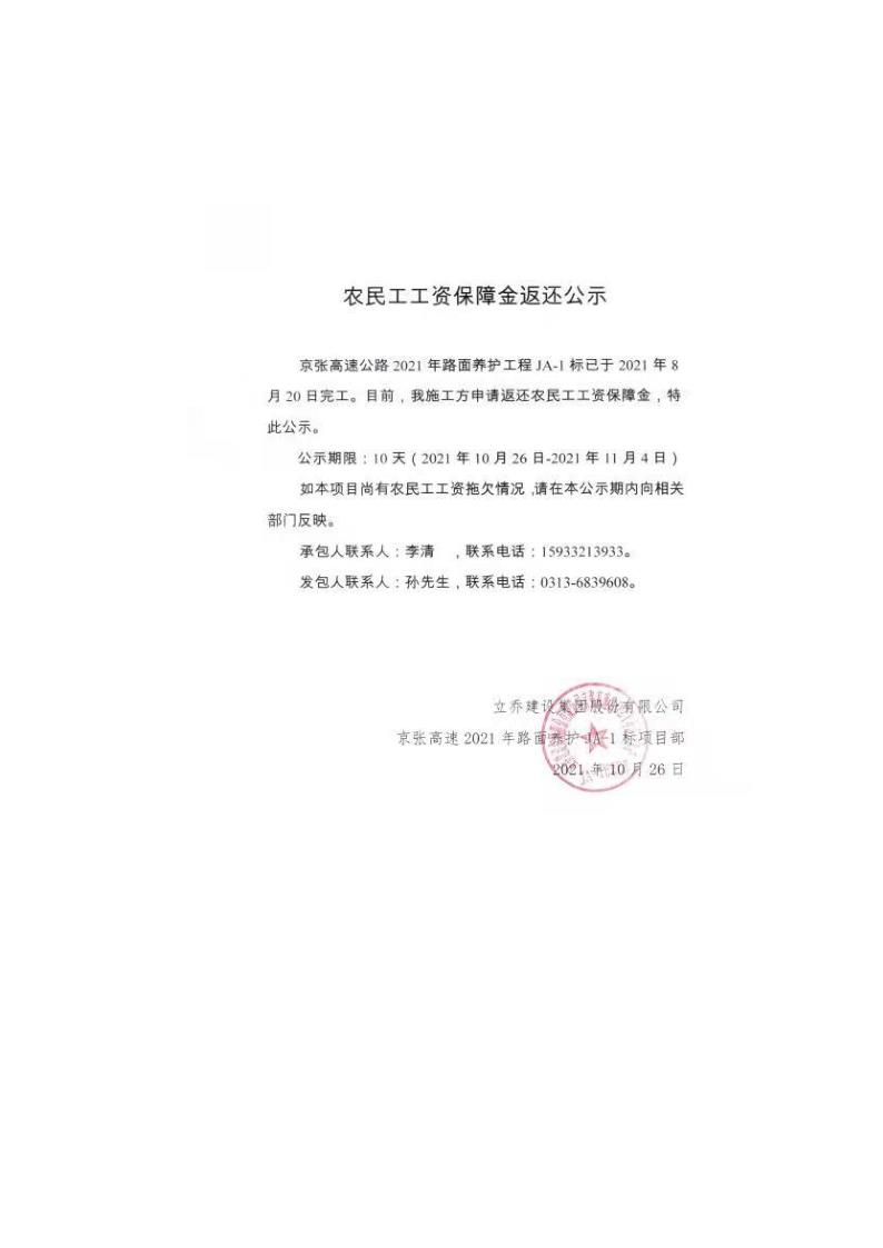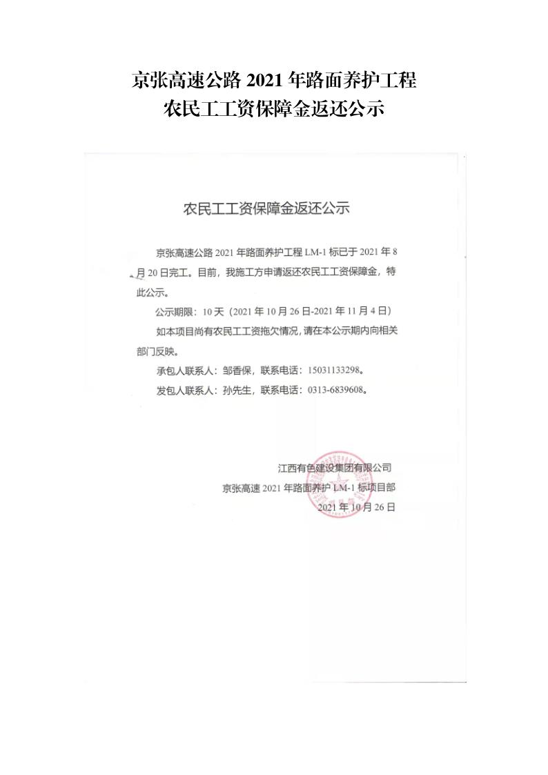 2021年路面養(yǎng)護工程農(nóng)民工工資保障金返還公示